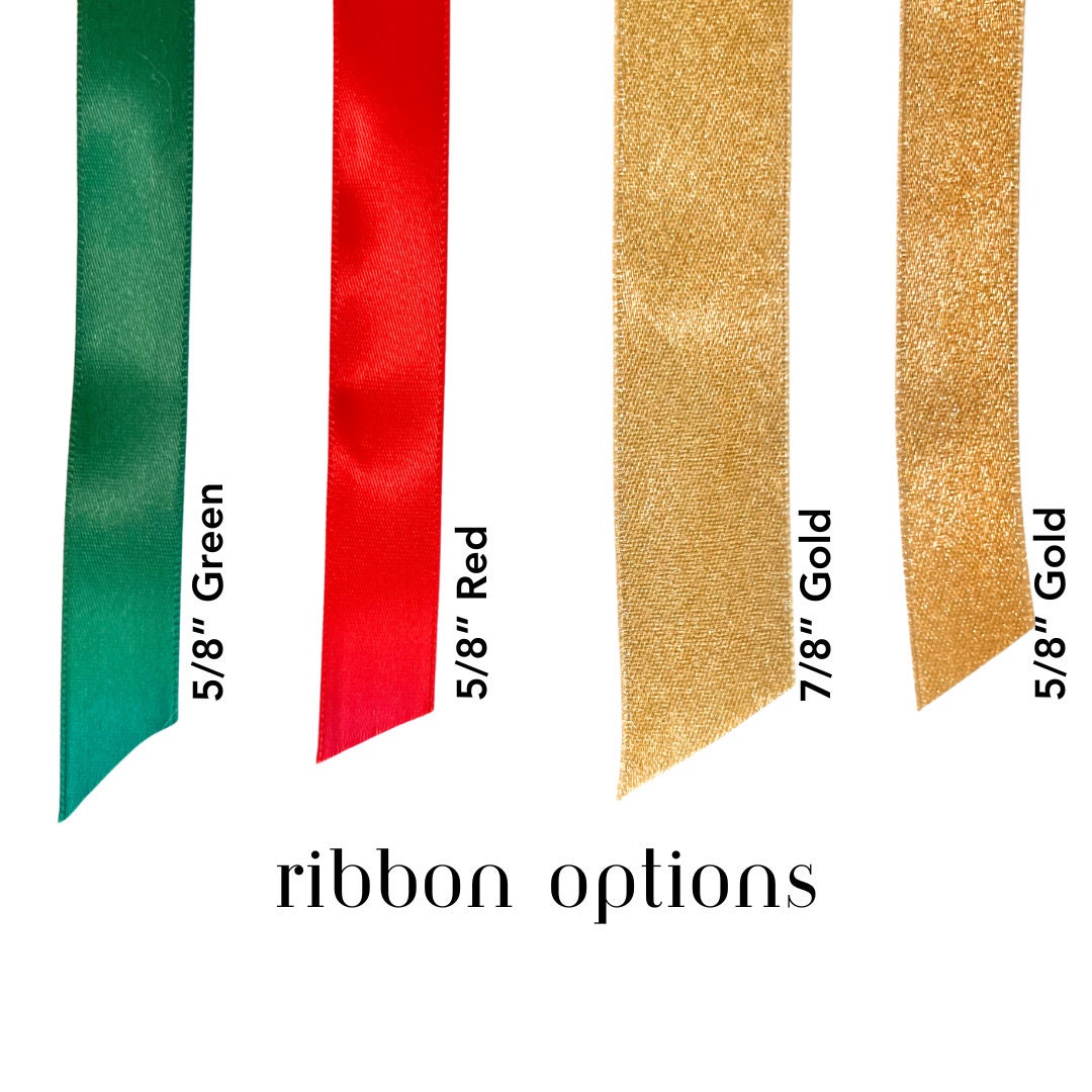 Tag is made from felt and will be machine embroidered. Tied with choice of Red, Green, or Gold ribbon.