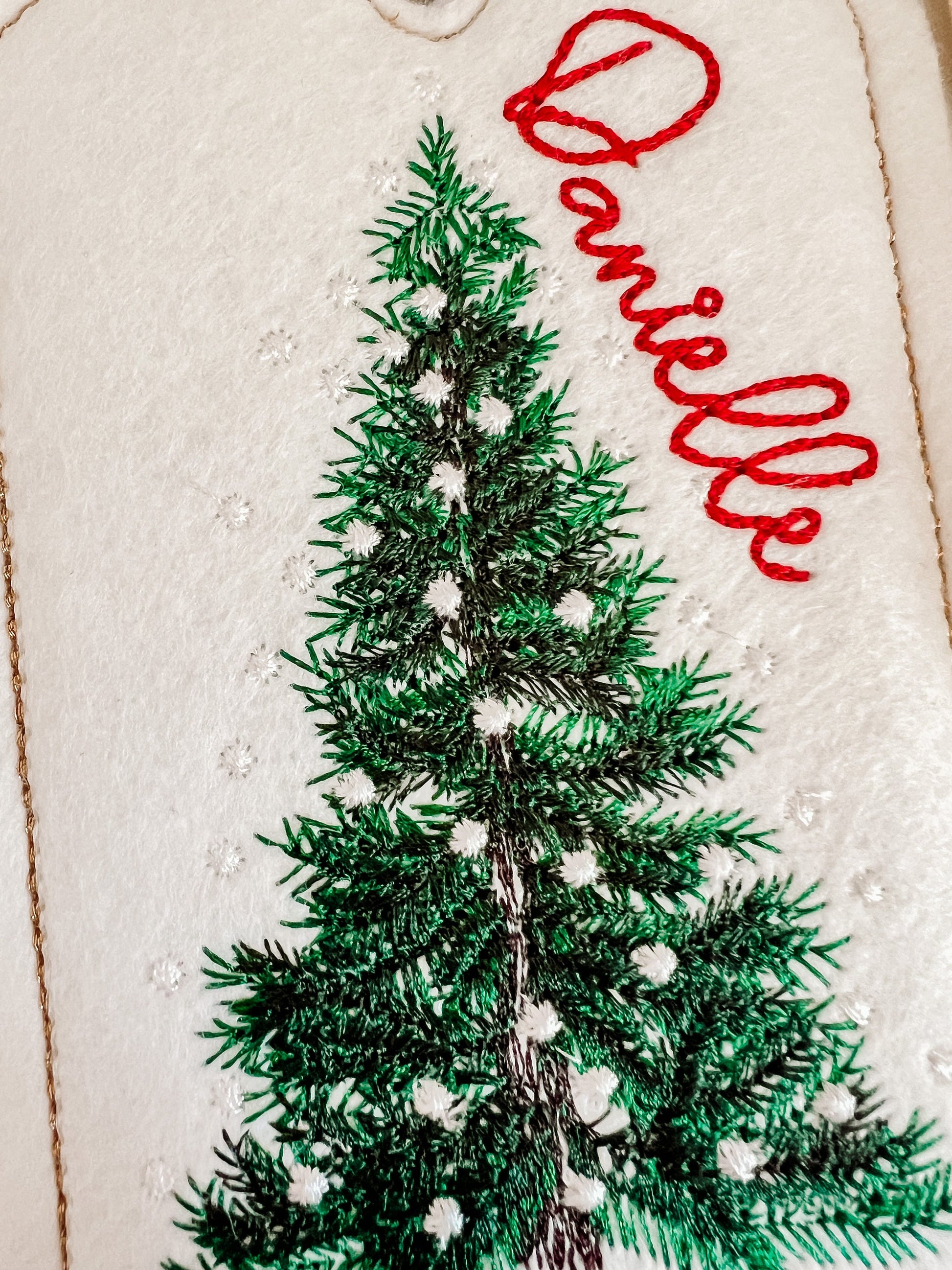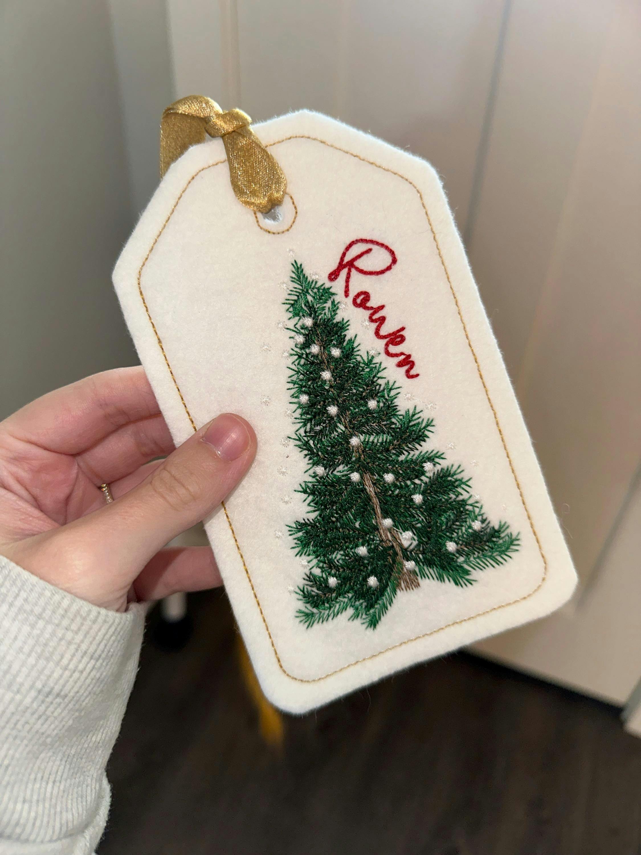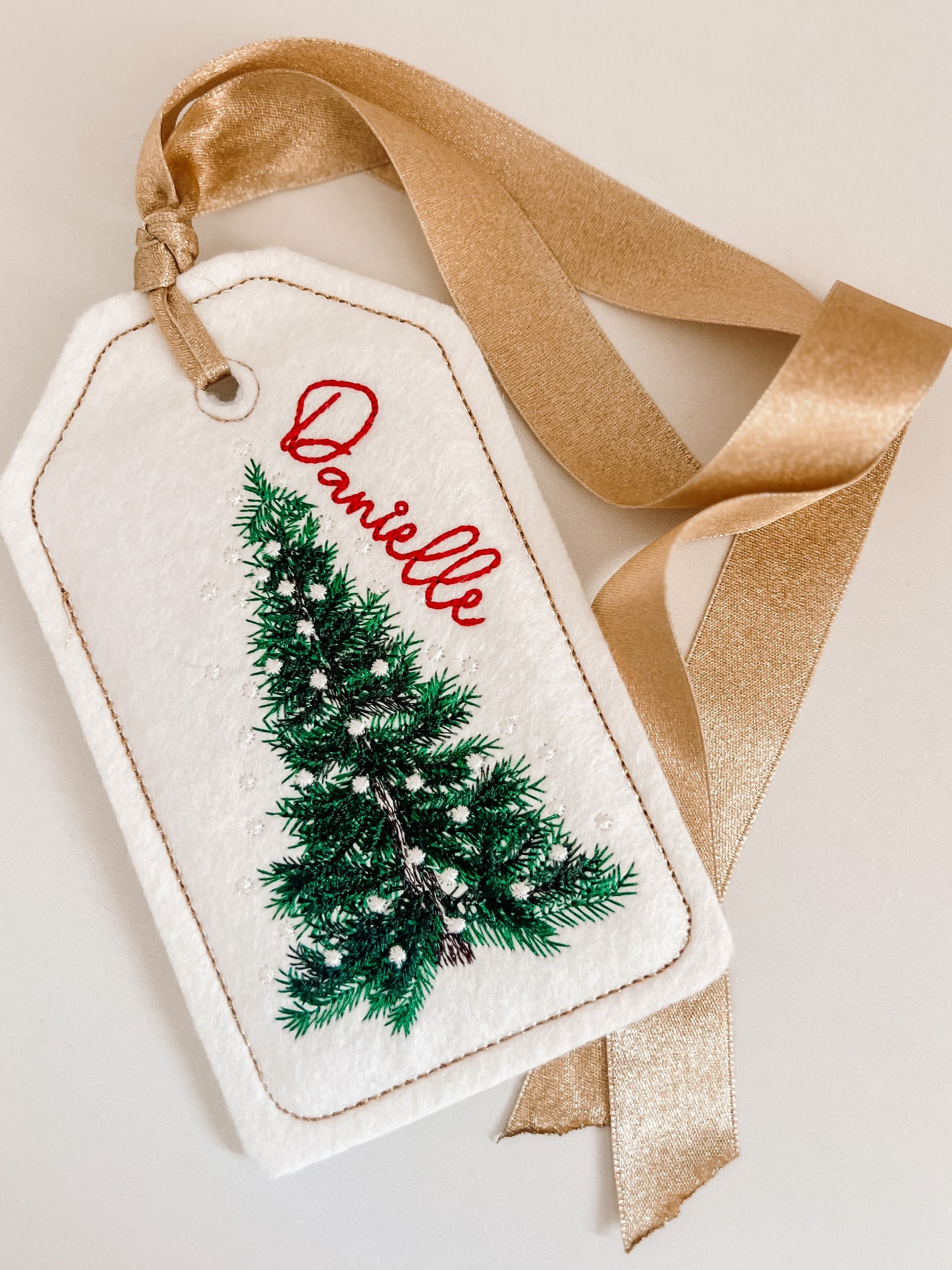 Tag is made from felt and will be machine embroidered. Tied with choice of Red, Green, or Gold ribbon.