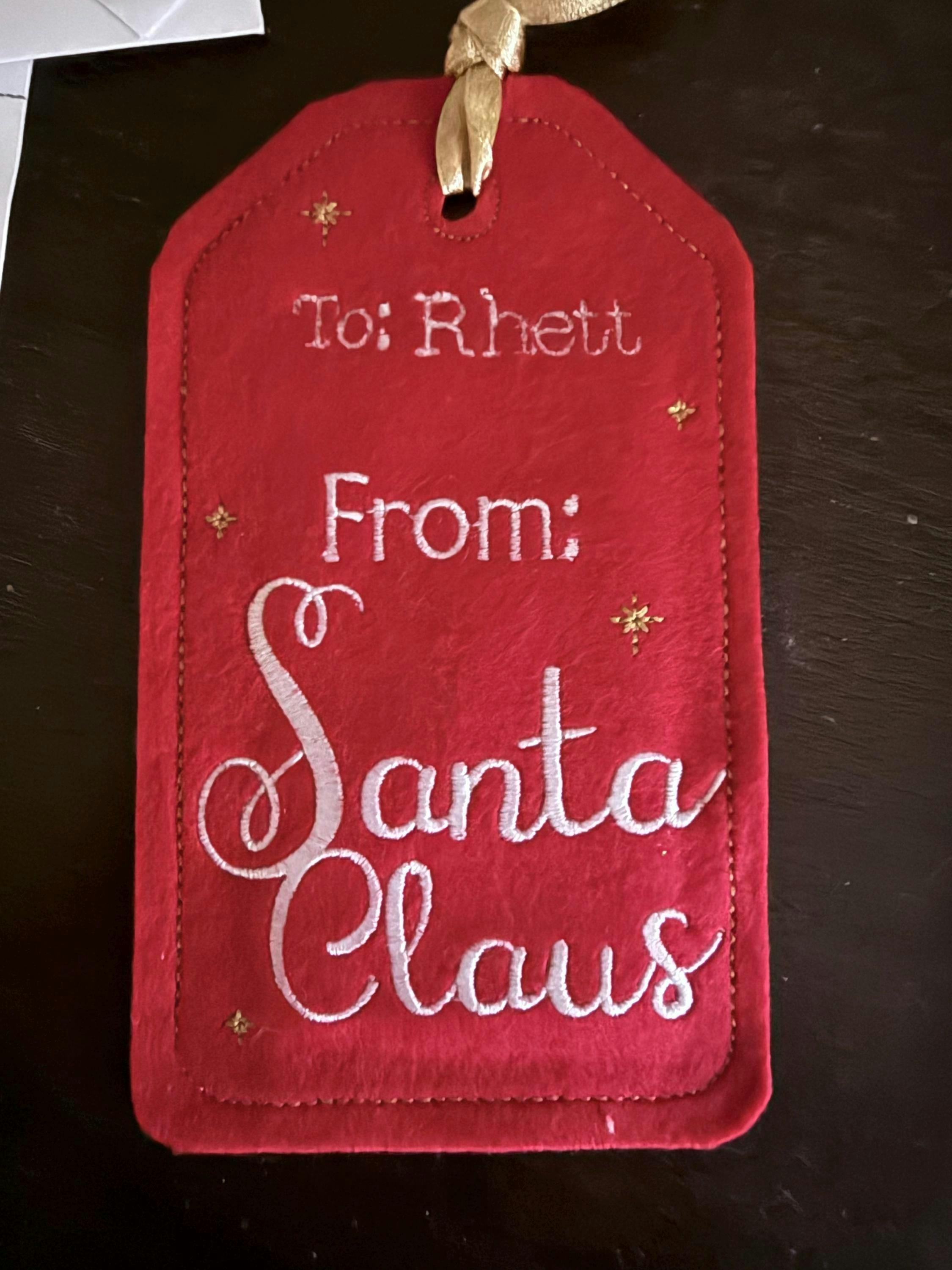 ⭐️ Personalized Embroidered Santa Gift Tag. Reuse each year for those special gifts or Christmas Stocking! Be sure to include personalization and check the spelling and capitalization of all names! Tag is made from stiffened felt and will be embroidered with white text and gold stars. Tied with 5/8" Gold Ribbon. (This ribbon is slightly more narrow than the ribbon in the sample photo.) Tag is 3.5x6 inches.