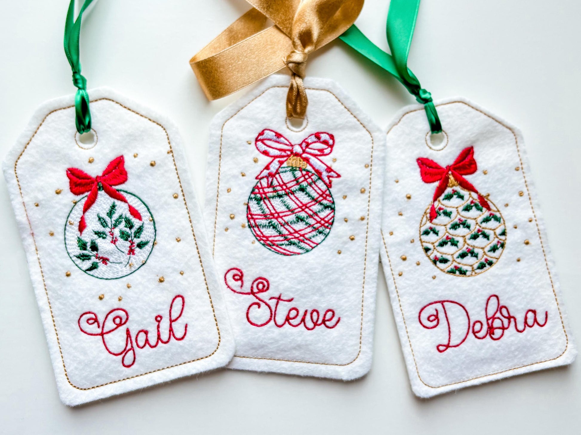 Tag is made from felt and will be machine embroidered. Tied with choice of Red, Green, or Gold ribbon.